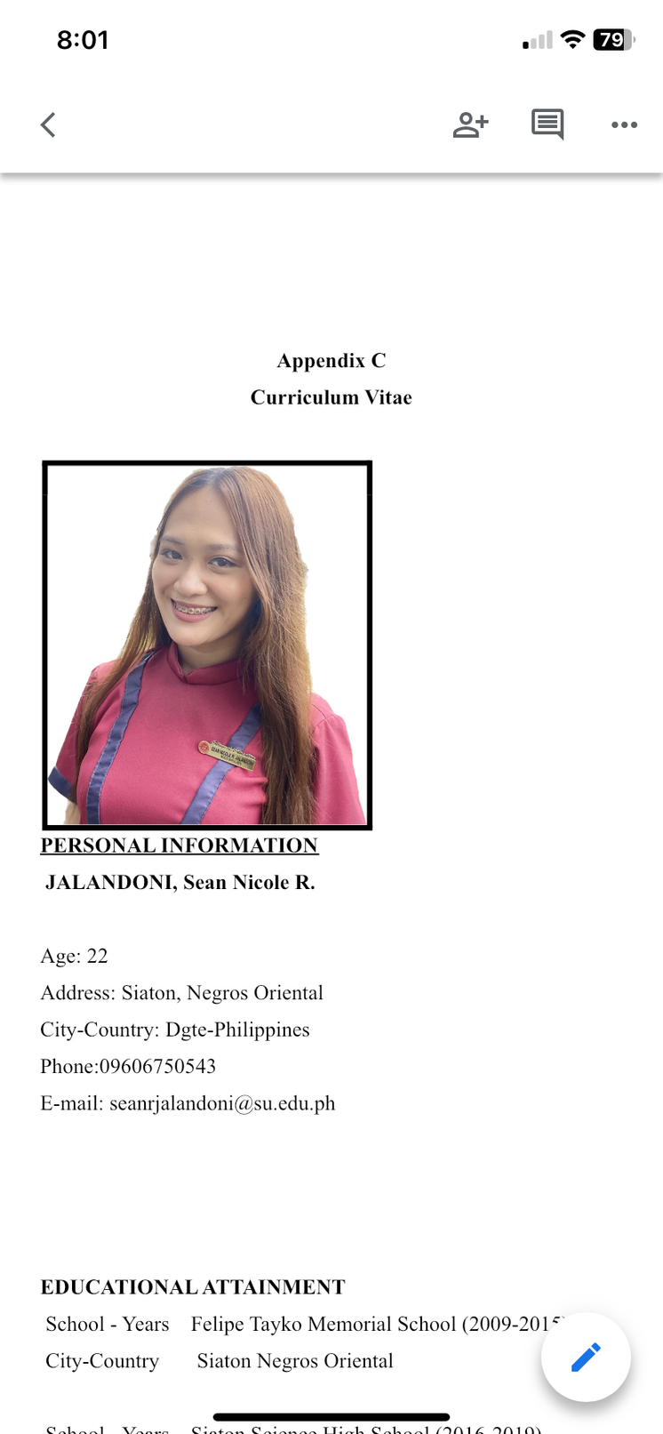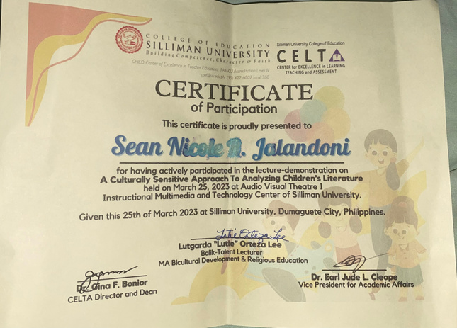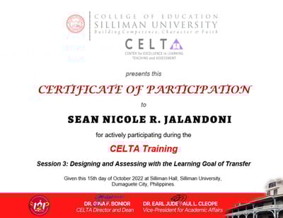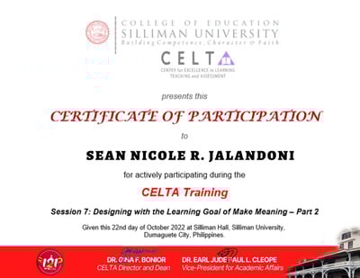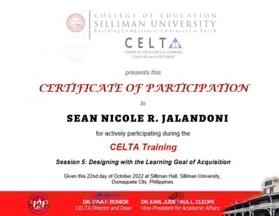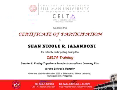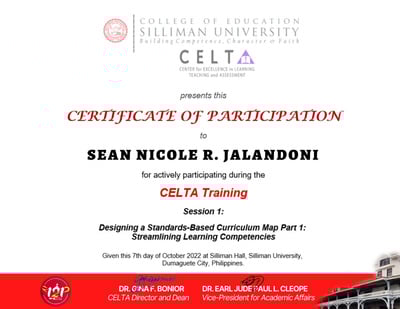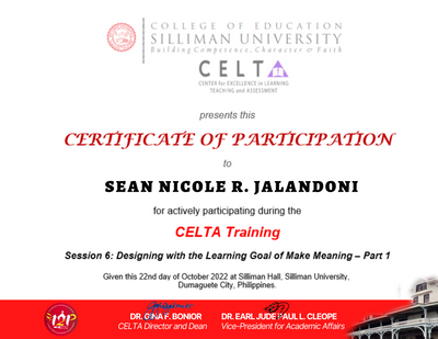 "I am very much thankful to our Almighty God, for giving me wisdom, guidance and blessings all throughout my student teaching experience. I am grateful to my ever supportive parents, for never leaving my side. Thankful for my cooperating teacher, Mrs. Silot, for believing in me and for always making sure I am ready to impart knowledge to my students. Also, to our professor, Dr. Gina Bonior, thank you Ma'am, for believing and guiding us to become a better student teacher. God bless us all!"